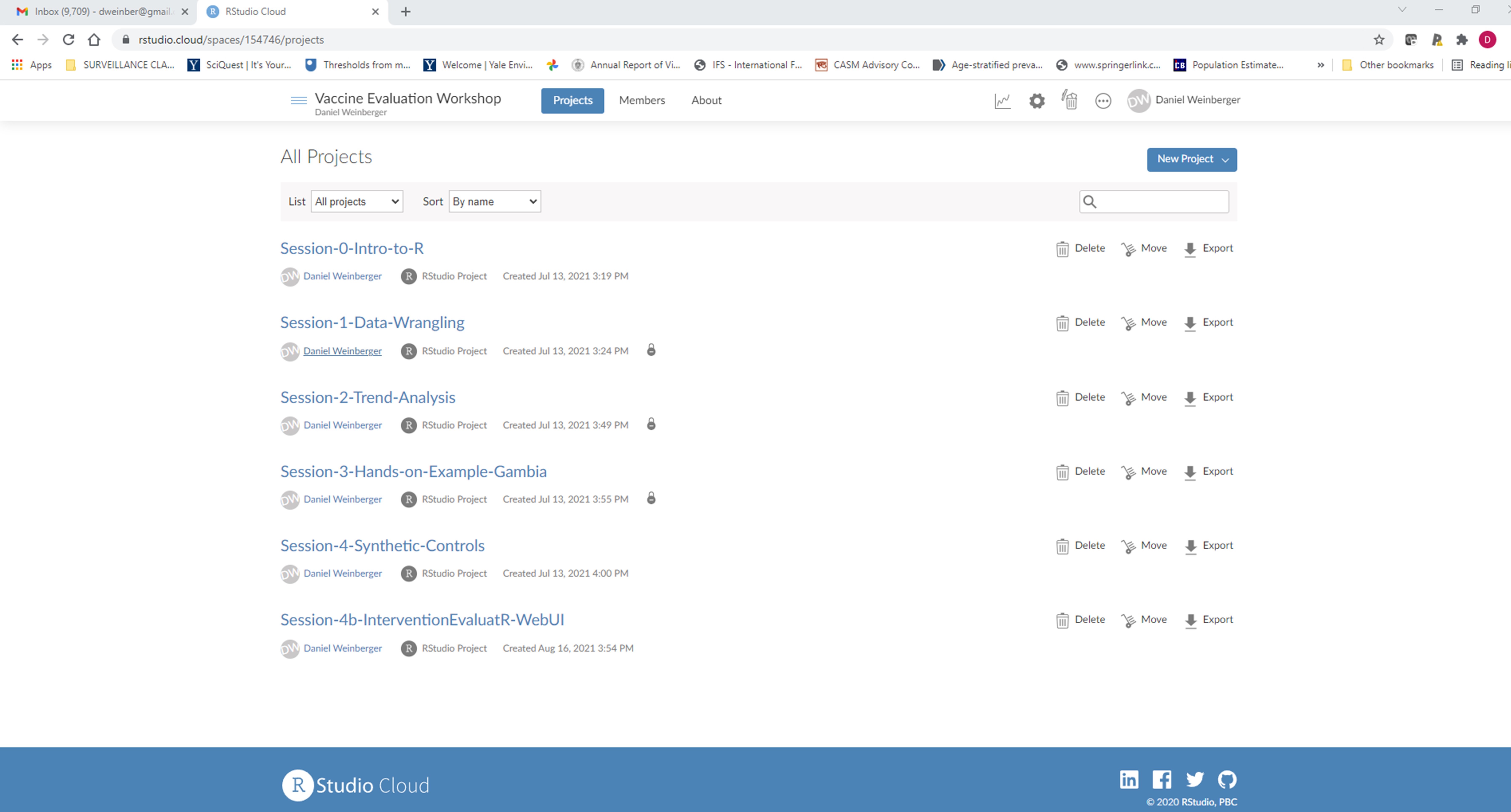 Run the workshop materials on your local machine on RStudio. All workshop materials are provided as a set of RProjects, which can be access from https://github.com/orgs/VaccineEvaluationWorkshop